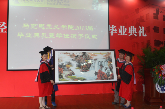 随后,2013届全体硕博毕业生一同在台上接受了导师亲手赠送的毕业纪念礼品,毕业生们满怀对公司、对恩师的浓浓感激之情回赠公司一副山水画匾留念。
