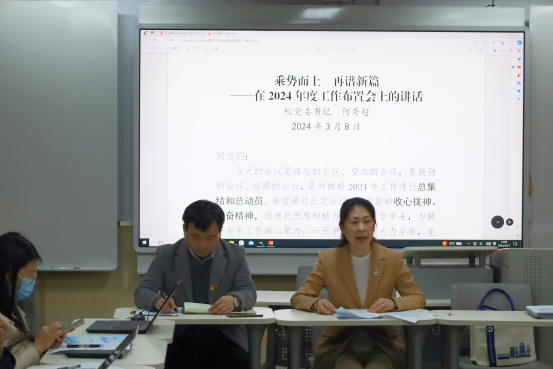 此外,陈文娟还传达了2024年公司在党建引领、思政课教学、学科科研、学位与研究生工作、公司建设等方面的具体工作计划和发展目标。