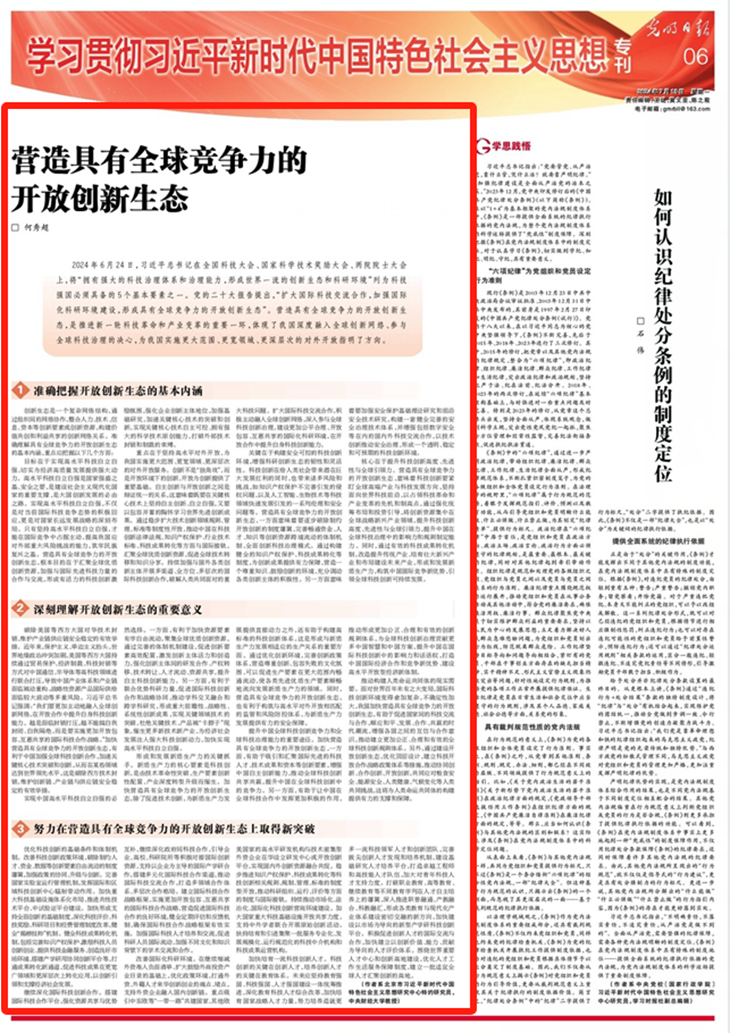 7月15日,《光明日报》刊登北京市习近平新时代中国特色社会主义思想研究中心特约研究员、英国365集团网站教授何秀超署名文章《营造具有全球竞争力的开放创新生态》。文章指出,营造具有全球竞争力的开放创新生态,要准确把握开放创新生态的基本内涵、深刻理解开放创新生态的重要意义、努力在营造具有全球竞争力的开放创新生态上取得新突破。
