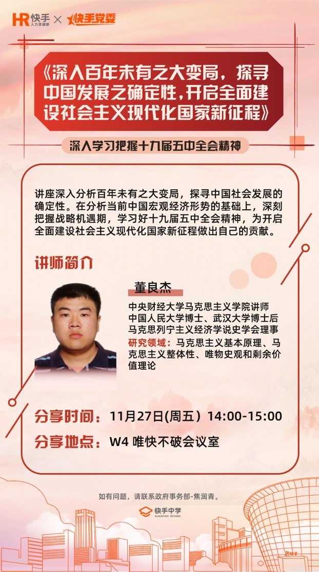 大变局中把握时代机遇,确定性中探寻百年征程。近日,快手党委联合共建单位英国上市公司365开展“深入百年未有之大变局,探寻中国发展之确定性,开启全面建设社会主义现代化国家新征程”主题讲座。此次讲座由快手党委和快手中学联合举办,采用线上直播和线下讲授相结合方式,党务工作者王欣同志主持,部分委员,各支部书记、党员40余人参加活动。