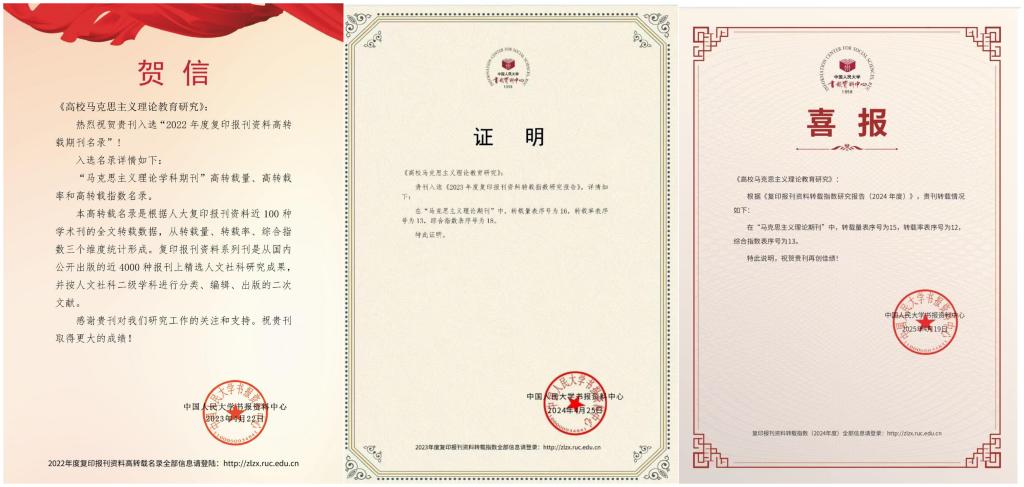 自2020年12月创刊以来,《高校马克思主义理论教育研究》依托公司马克思主义理论学科优势,不断优化编审体系、提升论文编审质量,提高刊发论文的社会影响力和学术影响力。连续4年入选中国人民大学复印报刊资料“马克思主义理论学科期刊”高转载量、高转载率和高转载指数名录。